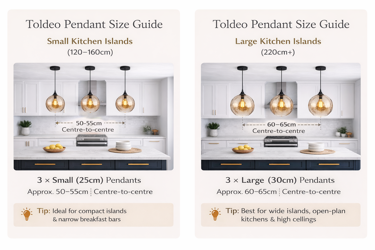 Available in two sizes — 25cm and 30cm diameter, the Toledo pendant offers flexibility for different island lengths and ceiling heights. Use three matching sizes for a symmetrical, design-led look, or select the larger size for wider islands where stronger visual impact is desired. Whether styled individually or grouped together, Toledo provides a cohesive, designer finish that enhances the overall flow of your kitchen.