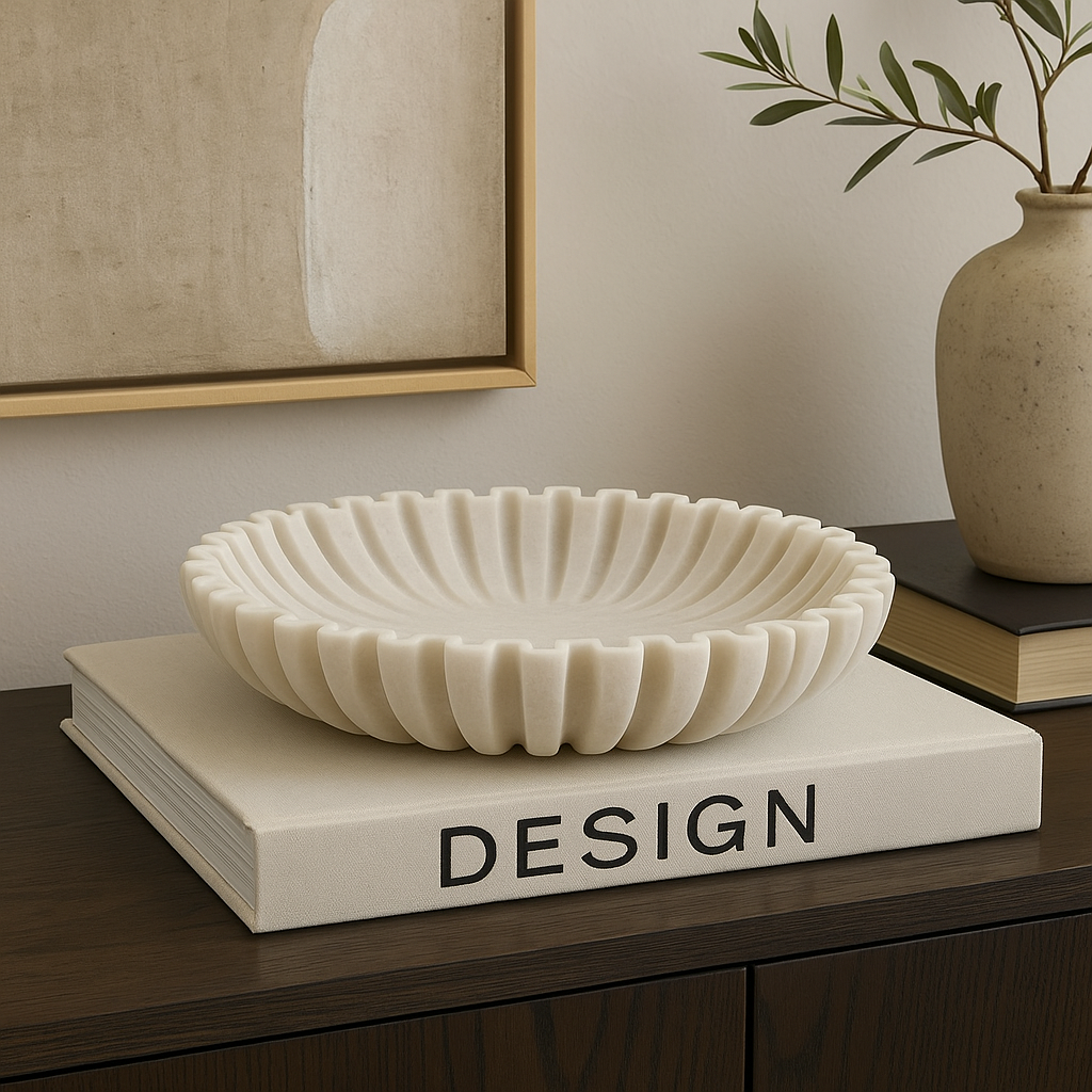 Luxury lifestyle image of a white marble scalloped bowl with no filling, styled on a large design book atop a dark wooden sideboard with artwork and a ceramic vase.