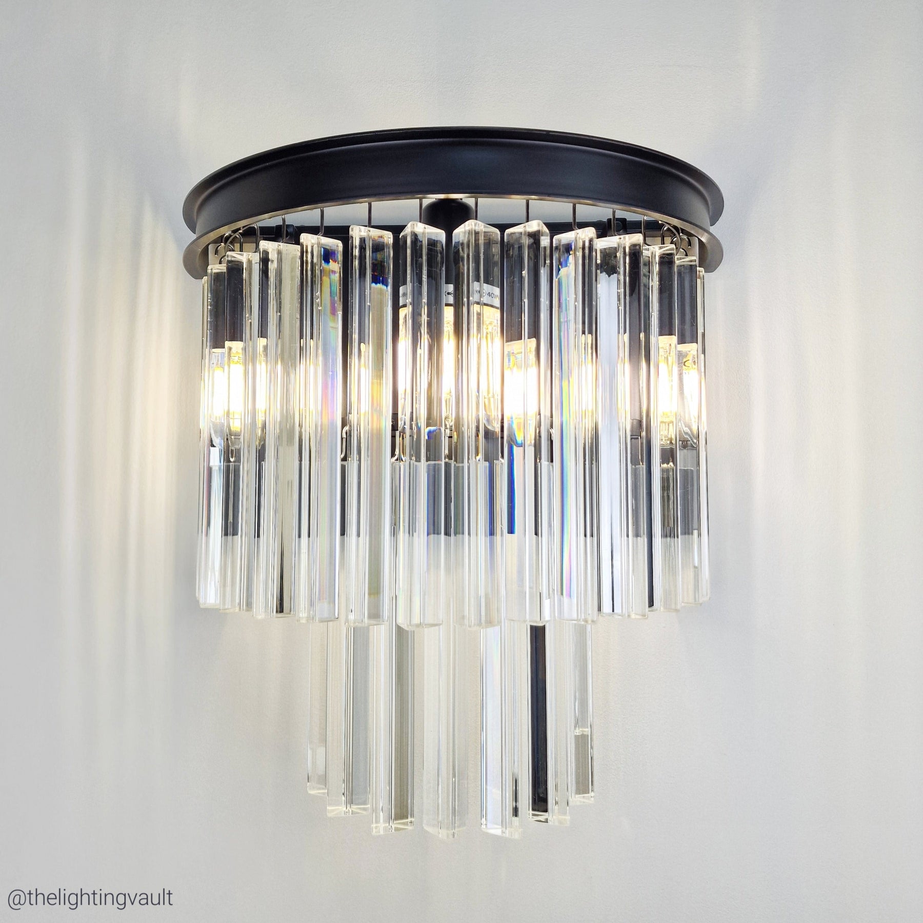 The spectacular Seville wall light has a tiered frame that is finished in matt black with large clear triangular shaped crystals creating a stunning effect. This large wall light is perfect for bigger rooms and features three light bulbs for extra light. The unique triangular shaped K9 crystals complete a beautiful statement wall light, Matching ceiling lights are also available.
