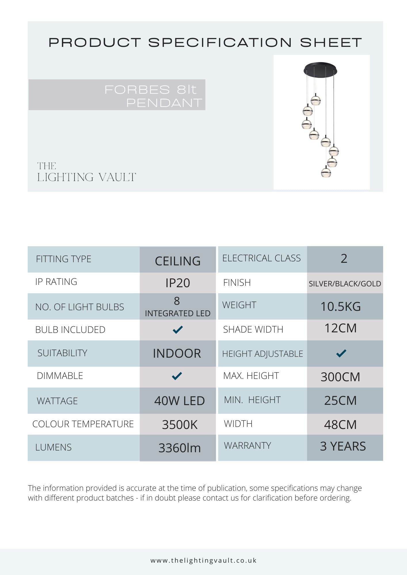 Every detail of the Forbes reflects premium craftsmanship—from the weight of its solid construction to the flawless finish of its glass shades. Built to last, it comes with an extended 3-year warranty and dimmer compatibility, allowing you to tailor the light to suit the mood of any occasion.