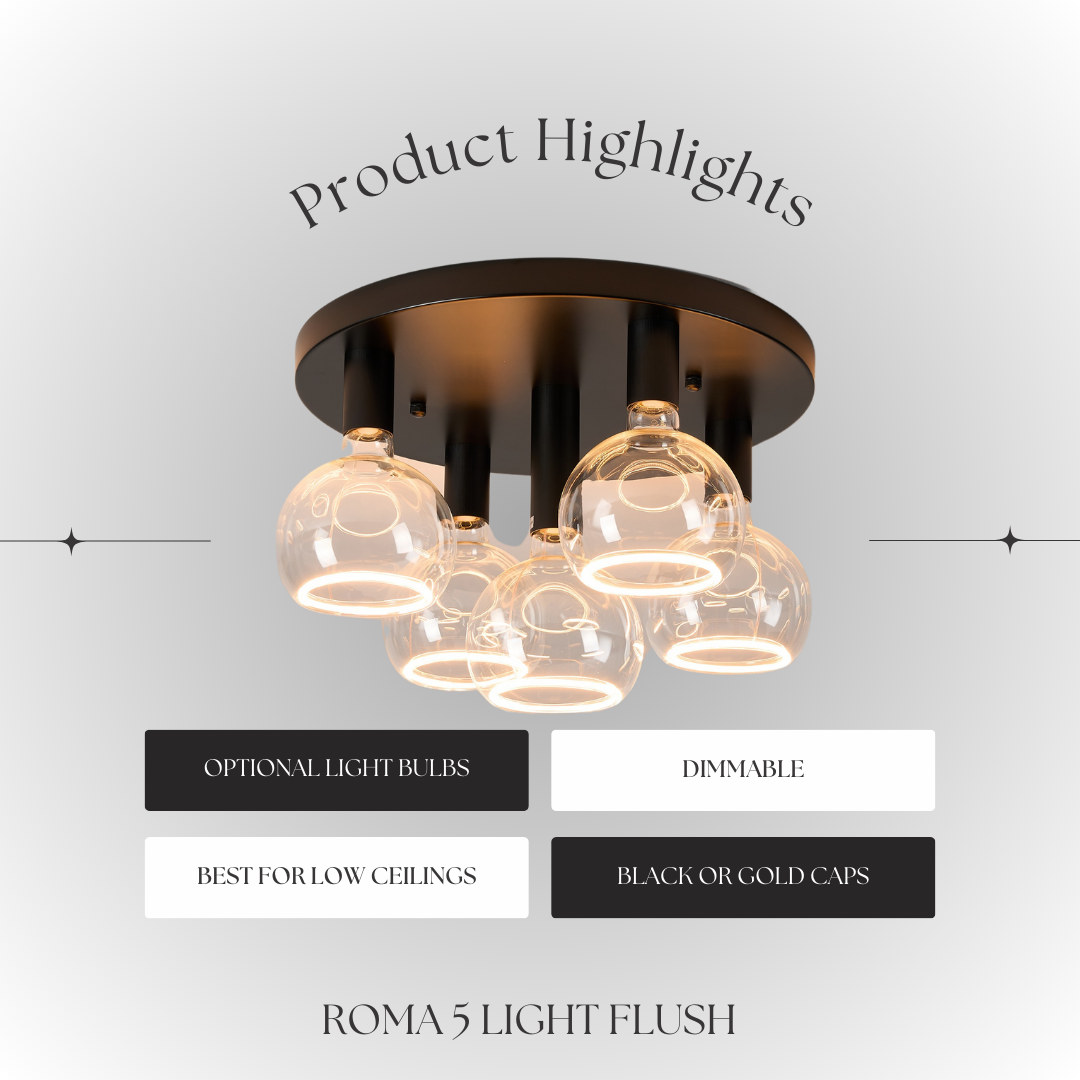 The simple design Roma flush is finished in matt black with a choice of either matching matt black or matt gold finish trim. The Roma flush would be perfect in a hallway or bedroom and has a modern, clean style. There are other matching pieces available in the Roma collection.