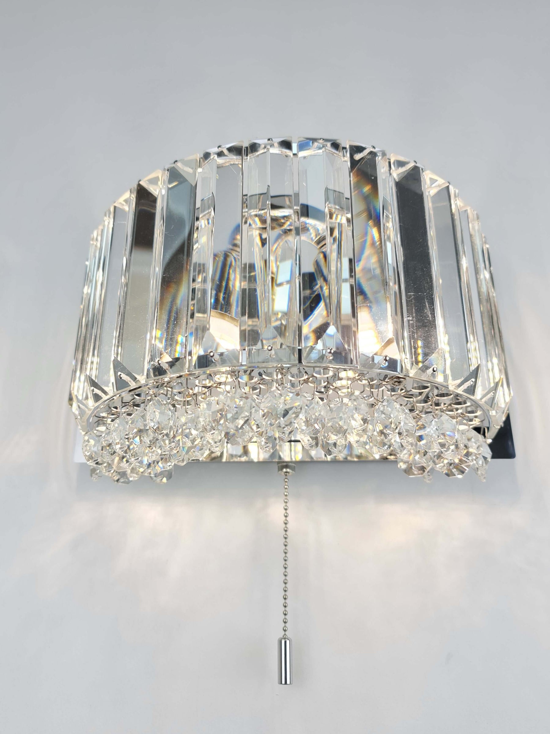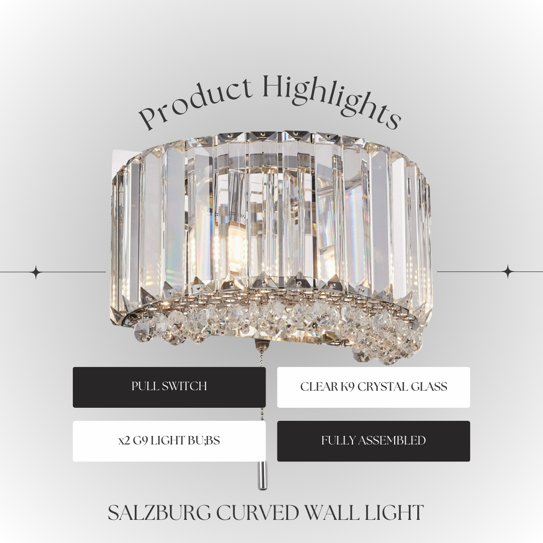 Transform any wall into a modern masterpiece with the Salzburg Curved Wall Light. Crafted from polished chrome and adorned with exquisite K9 crystal detailing, this sculptural fixture features large rectangular crystal blocks paired with a cascading skirt of crystal buttons—all framed by a sleek mirrored chrome border that reflects light from every angle. The result is a mesmerizing interplay of sparkle and shadow, creating an atmosphere of refined glamour.