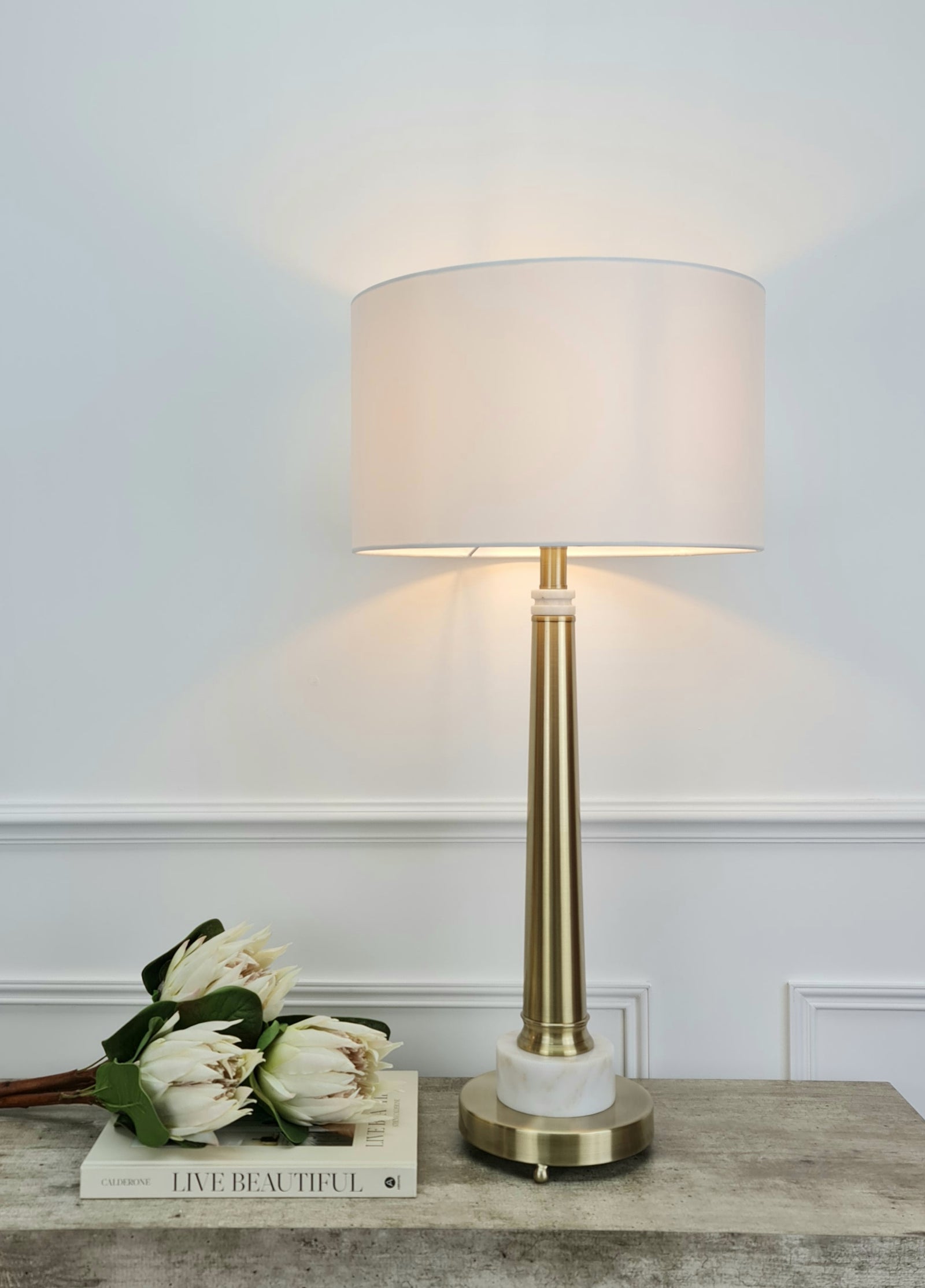 The beautiful Elana table lamp features long glass rods in frame that is finished in black and topped with a white linen lamp shade. This is a large table lamp which makes a statement.