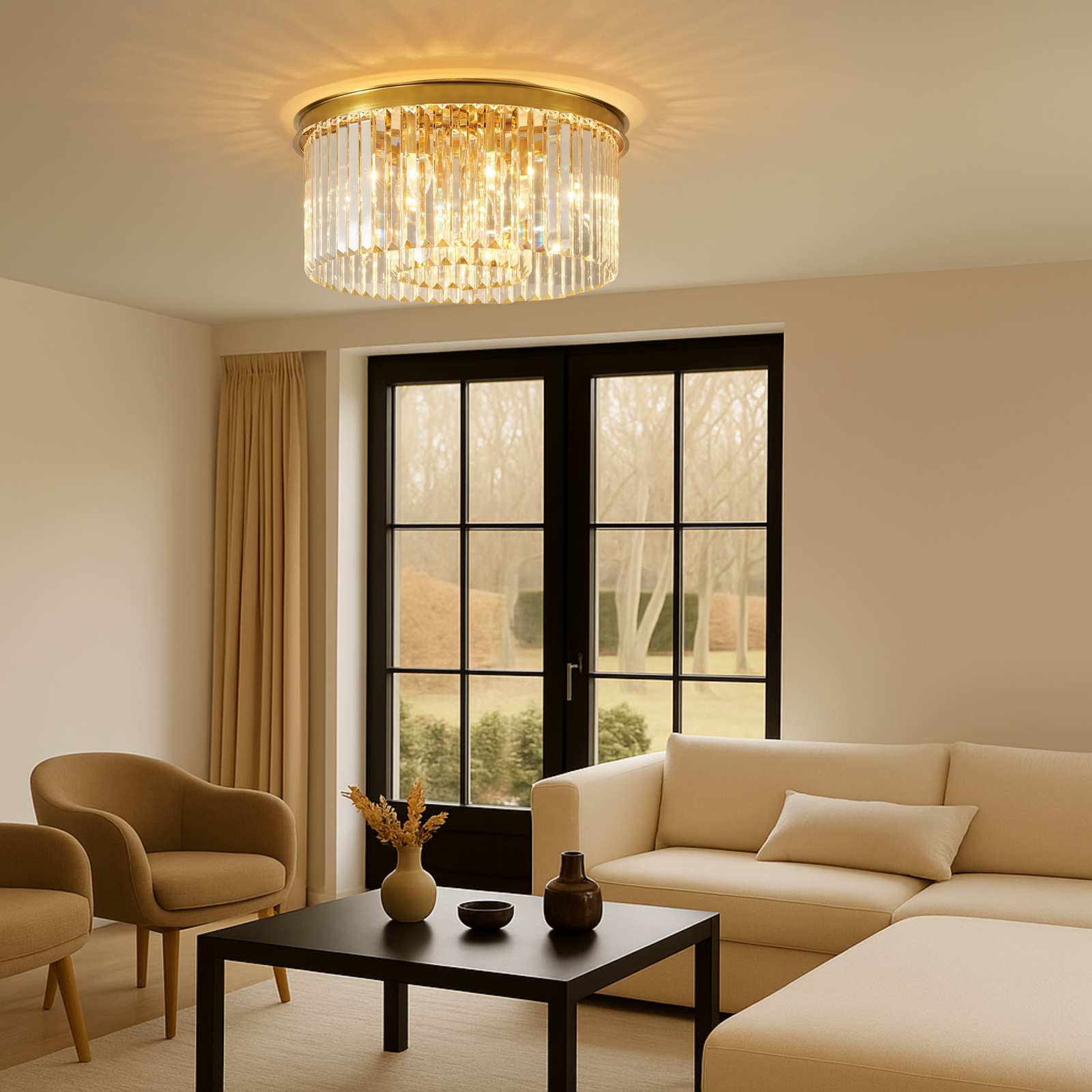 Designed for rooms with lower ceilings yet no compromise on impact, the Murcia’s tiered structure adds instant drama and sophistication. The warm gold finish complements neutral and modern interiors alike, while the intricate glass detailing enhances the ambience with soft, golden illumination.