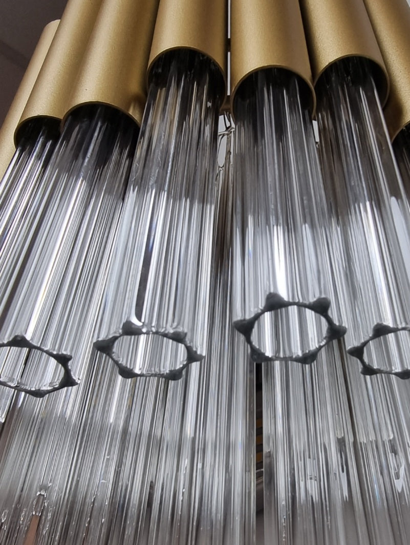 Elevate your interiors with the exquisite Murcia Wall Light, a statement in modern luxury and refined craftsmanship. Designed with precision, this striking fixture pairs sleek gold cylindrical frames with delicately ribbed glass rods, creating a stunning interplay of light and texture. The layered composition allows warm illumination to cascade softly through the glass, producing a radiant yet soothing ambience.