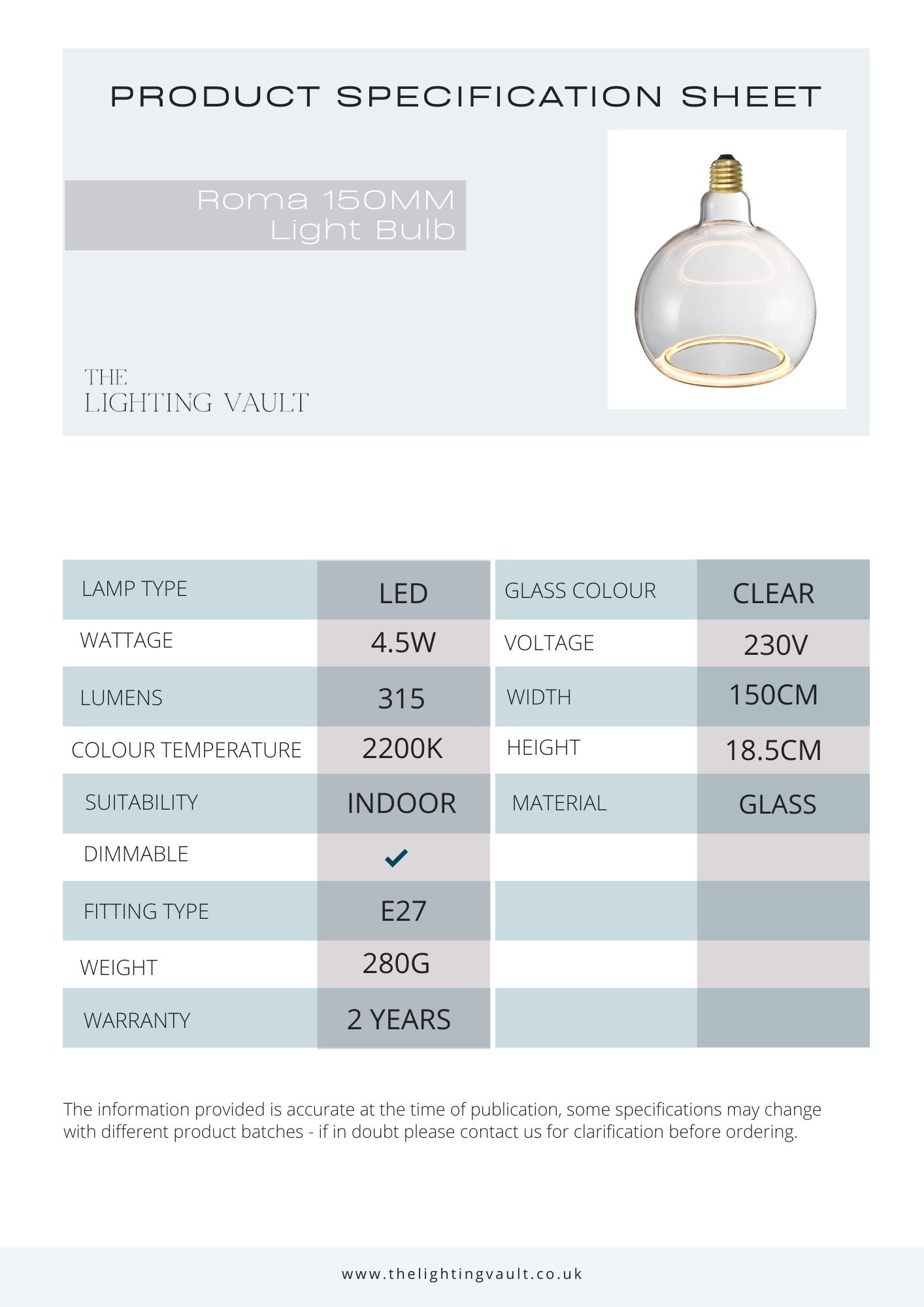 Our beautiful extra large Roma Globe style light bulbs create a stunning effect with a unique design in a warm white tone. The bottom of the light bulb is open with the filament sitting in a round open frame. These light bulbs create the perfect effect when you require a soft and subtle light. The globe shape looks perfect in round glass pendants or in exposed lamp holders. Other sizes and also a smoked glass version are available in the Roma Globe collection.